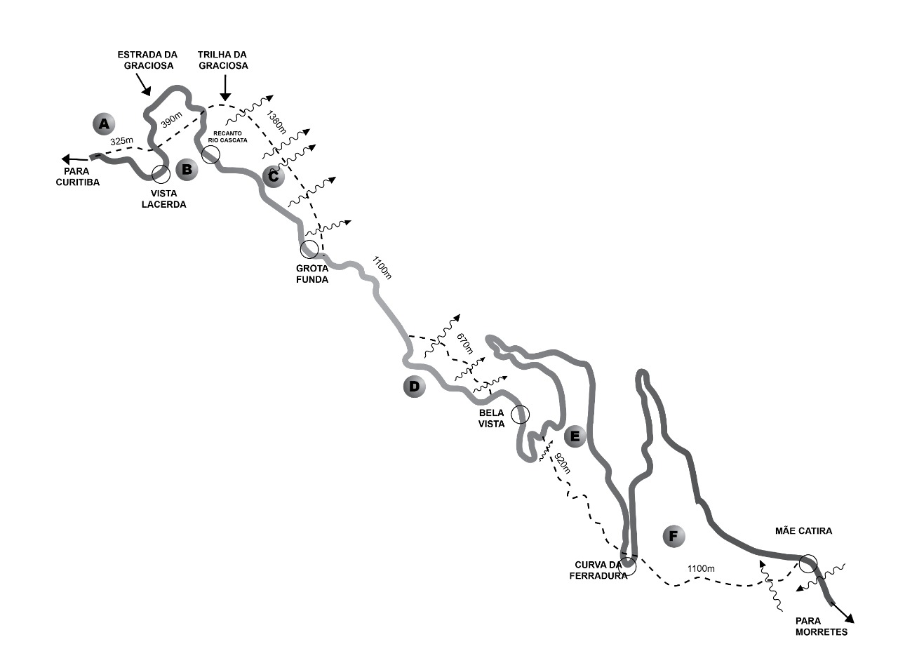 Pela trilha lateral direita, subindo a serra, o traçado original começa no fundo da baía de Antonina, seguindo o curso dos rios Graciosa, Nhundiaquara e São João, e avança em direção ao grande vale que abriga o rio Mãe Catira, para desembocar no distrito de Borda do Campo, no município de Quatro Barras. Posteriormente essa trilha ficou conhecida como Caminho da Graciosa e, em cima dela, foi aberta a Estrada da Graciosa, o lindo trajeto turístico por dentro da Mata Atlântica, que levou vinte anos para ser construído e foi finalizado em 1873.